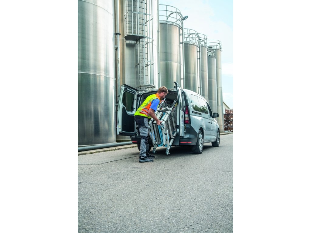 Kompaktní teleskopické sklapovací pojízdné lešení na cesty.