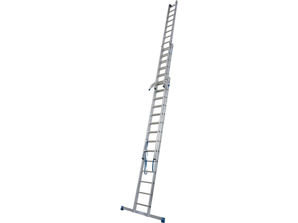 Trojdílný aluminiový víceúčelový žebřík, použitelný jako opěrný, výsuvný a samostatný žebřík s výsuvnou částí.